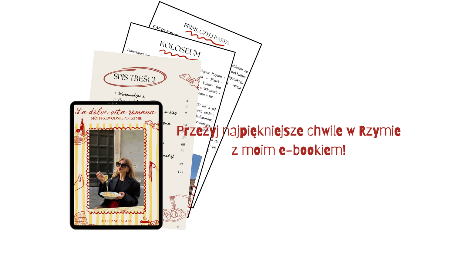 Ciao! Nazywam się Aleksandra i choć z zawodu jestem prawnikiem, doktorem nauk prawnych oraz content creatorką, to moją prawdziwą od 18 lat są Włochy i kultura włoska. Przez rok miałam możliwość mieszkać w Rzymie, dzięki czemu poznałam jego najpiękniejsze i najsmaczniejsze zakątki, którymi postanowiłam się podzielić, tworząc e-booka La dolce vita romana.